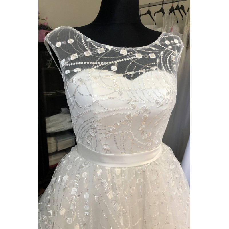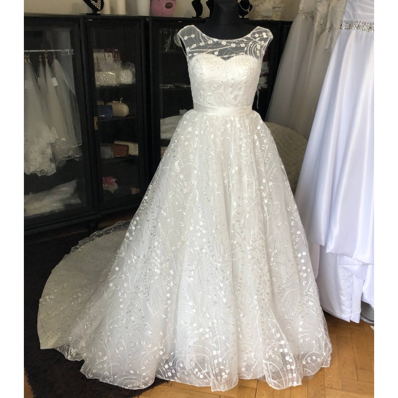 Luxusní krémové svatební šaty. Šaty mají netradiční vzor a krásnou bohatou princeznovskou sukni. Šaty jsou vyztužené a zezadu šité na šněrování pro lepší variabilitu. Pro bohatý efekt jako na fotce vhodné doplnit áčkovou spodničkou s jedním kruhem.
