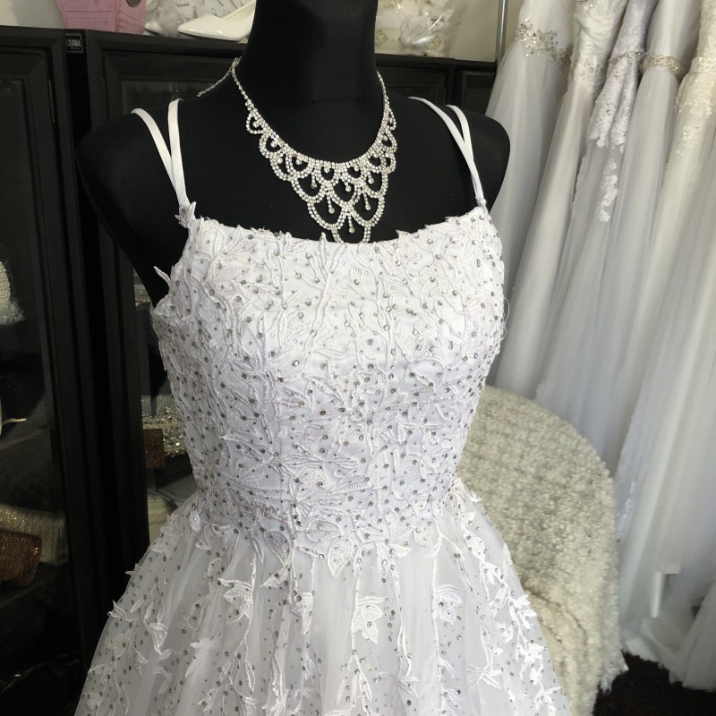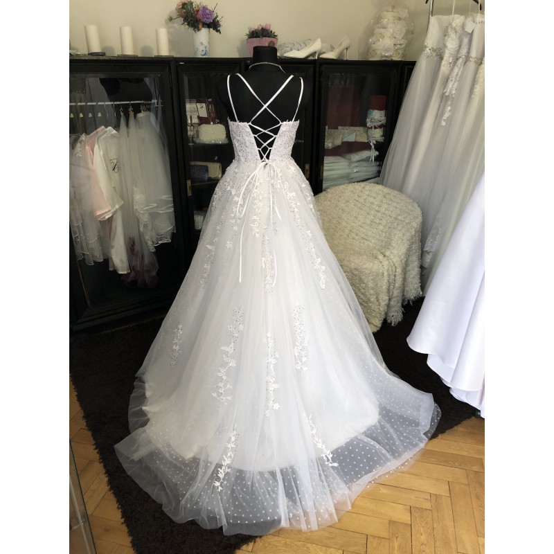 Krásné tylové svatební šaty s bohatou širokou sukní. Tyto šaty jsou šité na zip a široké otevřené šněrování a jsou vyztužené. Šaty jsou bohatě zdobeny malými kamínky a krajkovými aplikacemi, spodní tylová sukně je zdobena puntíčky. Vhodné doplnit áčkovou spodničkou, ale šaty je možné nosit i bez ní.